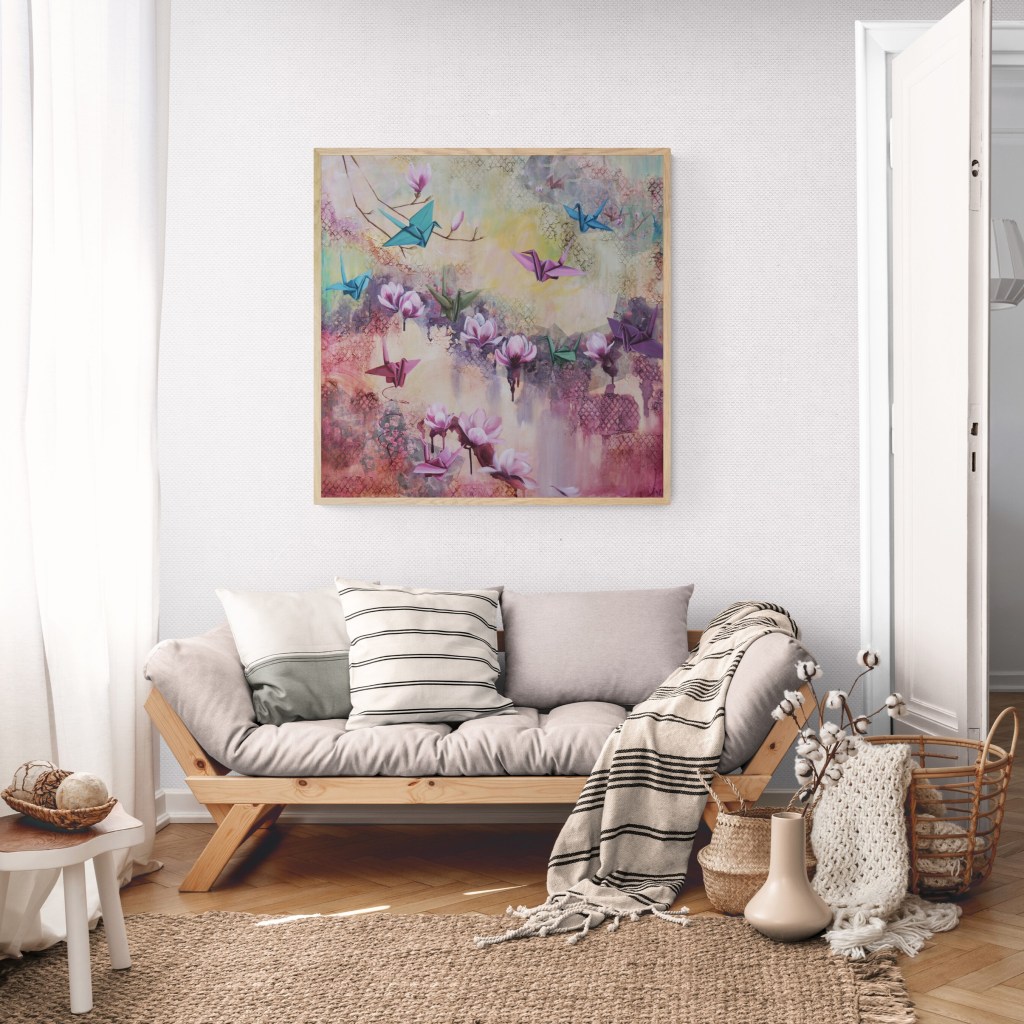 And I mean, look at this living room! It’s awesome. I feel like I know the family already: they’re grounded but fun, they’re into hygge and all things cozy, they have a giant shaggy dog that offsets the throw rug. They just needed a pop of color with a twist of whimsy in their living room, and boom. Enter Cranes in Bloom, a 36″x36″ acrylic beauty featuring 9 paper cranes flying among the magnolia branches.