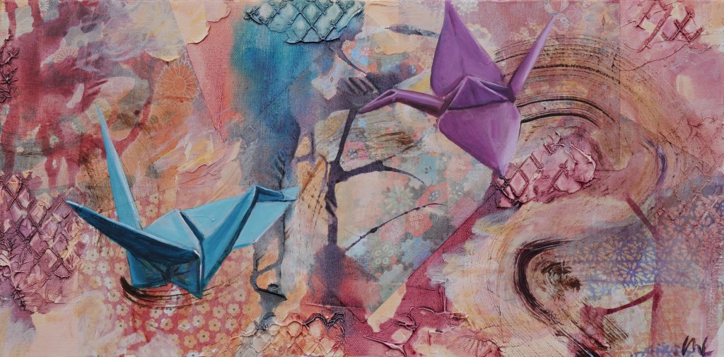 About a year after that, we were going through a different struggle. My son was being tested for autism, and it was another situation where I had no control. I just needed to keep moving forward. I had leftover origami paper, but wanted to do something different. I collaged it onto canvas and painted a crane overtop. Then I did two more just like it.